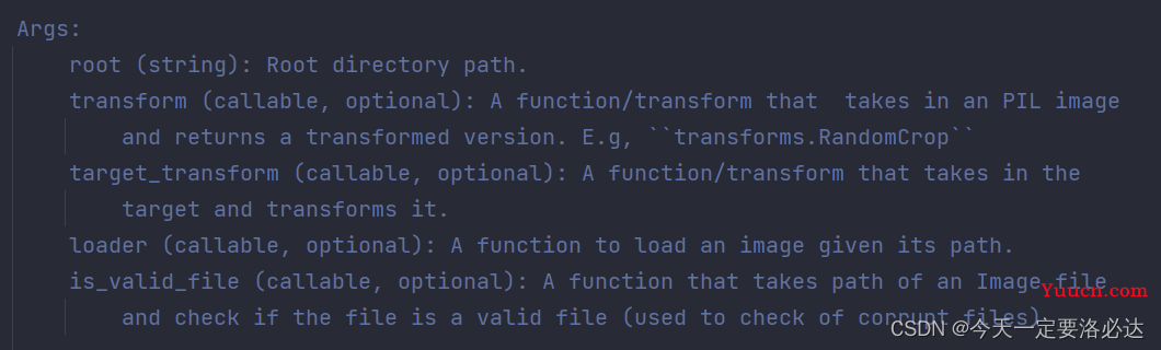 当然上面是最简单的形式,ImageFolder有好几个参数呢(上面只写了一个)。参数共有四个,介绍如下(前两个用的最多,不多做介绍了):